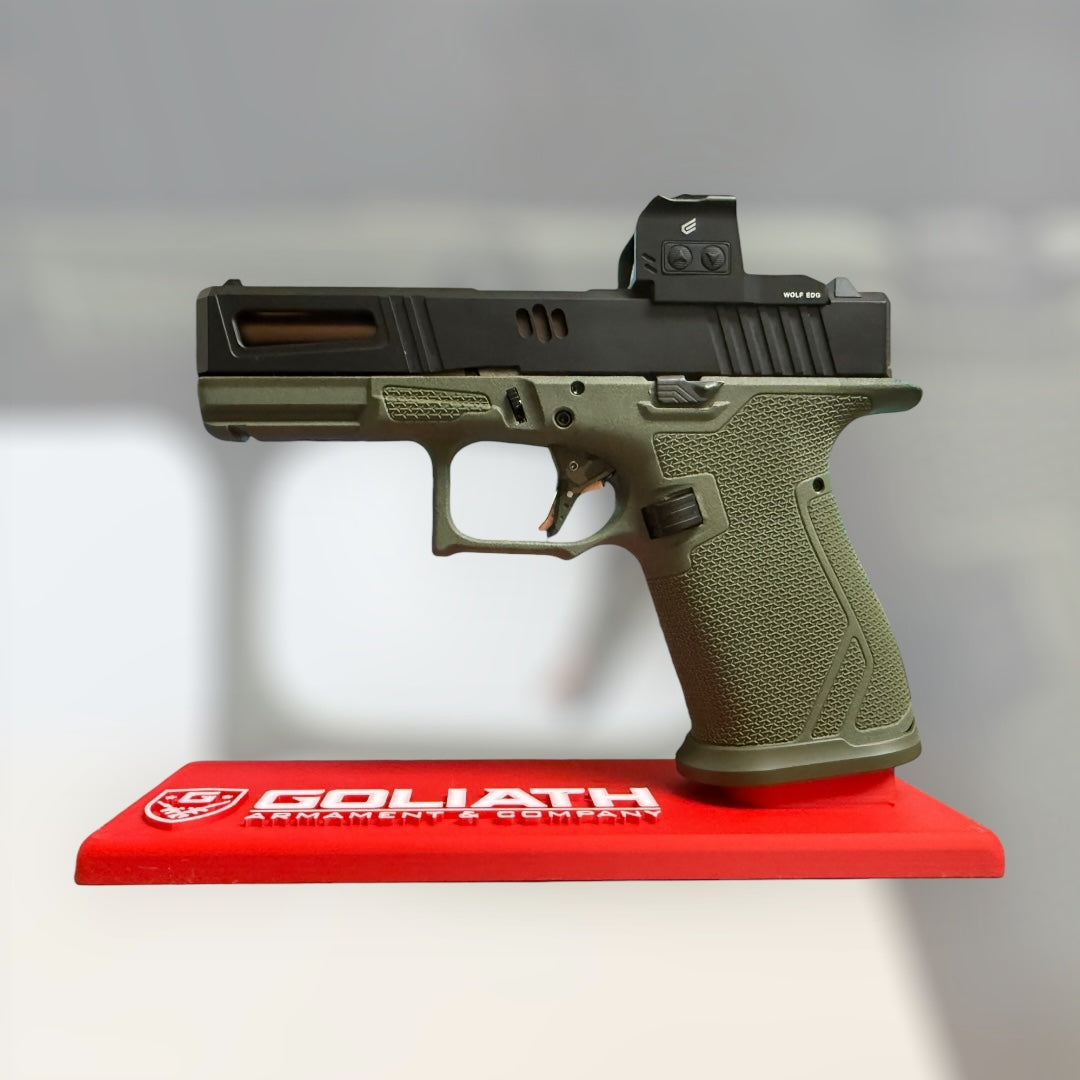 3D printed stand with no GAC logo for your Glock double stack. Fits G19/19x/17/45 and similar double stack Glocks. If you’d like the our GAC logo on it, mention it in the notes and I’ll print that one for you.